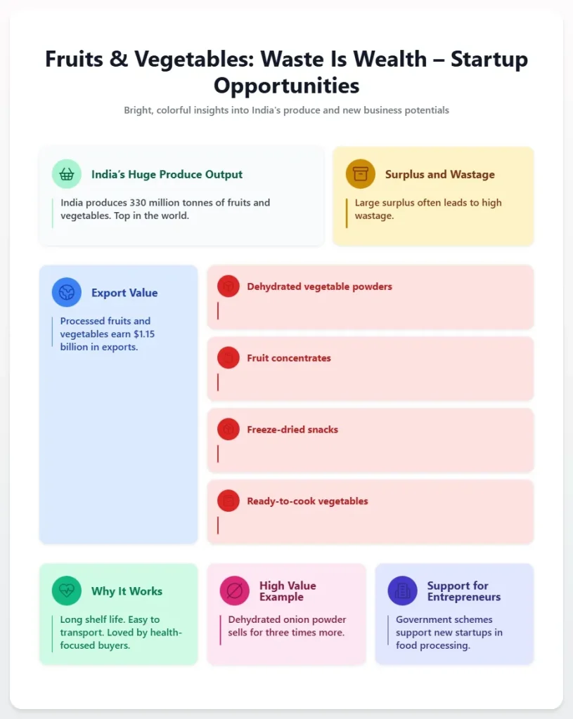 Startup Opportunities: India produces a surplus of diverse fruits, vegetables, pulses, spices, and milk, selling a majority of it in its raw form. This leads to minimal profits and excessive waste. Farmers lose income, and the country loses potential export revenue. About 20-25% of fruits and vegetables grown in India go to waste due to a lack of proper storage and useless processing.