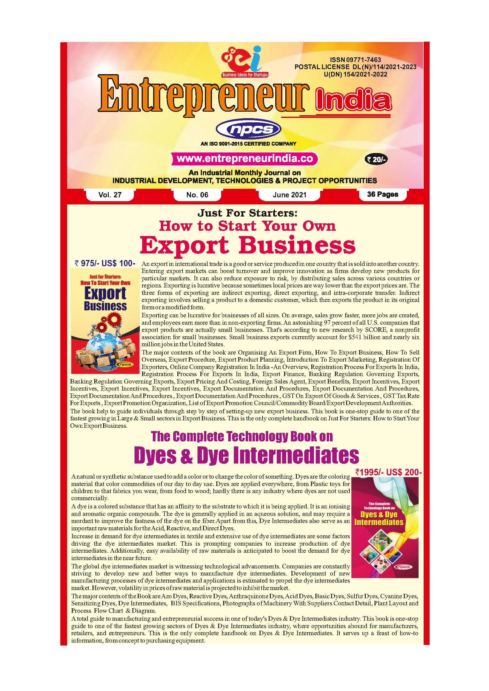 Monthly magazine divulged by NIIR Project Consultancy Services, “Entrepreneur India”, is intend at clarifying practice of choosing the convenient project for investments. If facilitate business decision and hassle-free by delivering a list of right projects for investment. Unparalleled amid project investment magazines, “Entrepreneur India” is devoted to the business of discern sound investment projects. Every emanate consist of a novel list of projects which are scrupulously chosen by the NPCS team after being showed on various investment factors. NIIR Project Consultancy Service team, before highlighting any project as right investment, get into the roots of its various appearances and facets of investment like the demand of a product, potential of current market, adequate location, and period of paying back, cost involved and profitability threshold.