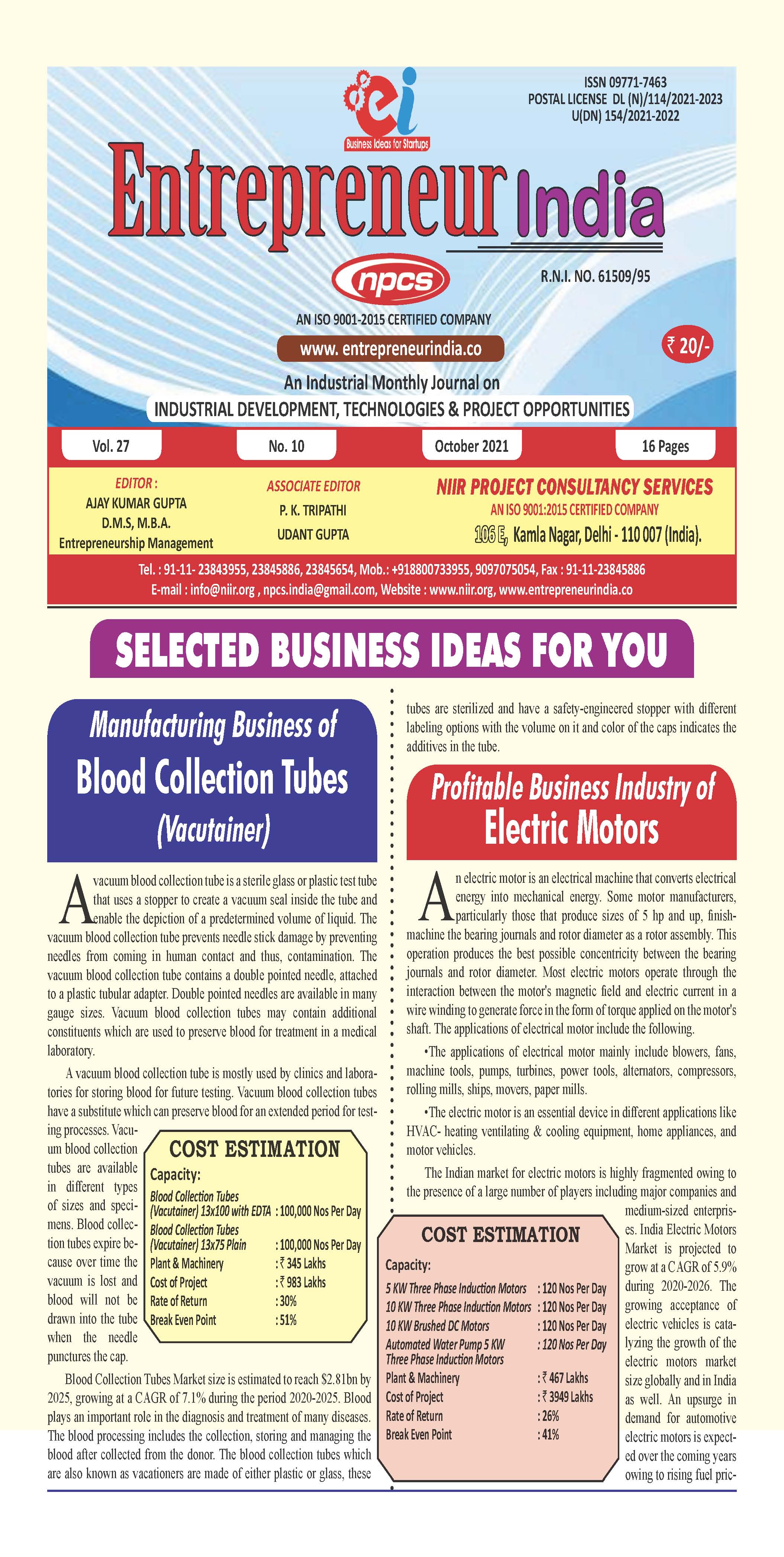 Monthly magazine divulged by NIIR Project Consultancy Services, “Entrepreneur India”, is intend at clarifying practice of choosing the convenient project for investments. If facilitate business decision and hassle-free by delivering a list of right projects for investment. Unparalleled amid project investment magazines, “Entrepreneur India” is devoted to the business of discern sound investment projects. Every emanate consist of a novel list of projects which are scrupulously chosen by the NPCS team after being showed on various investment factors. Niir Project Consultancy Services team, before highlighting any project as right investment, get into the roots of its various appearances and facets of investment like the demand of a product, potential of current market, adequate location, and period of paying back, cost involved and profitability threshold.