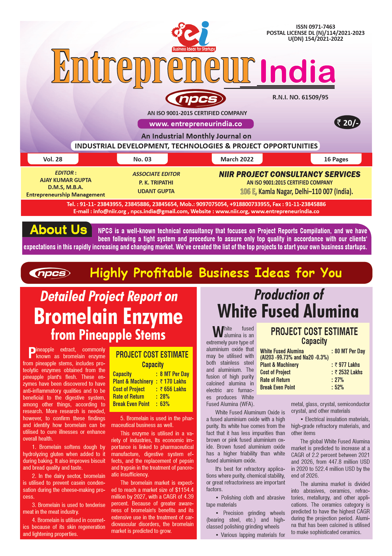 March 2022 Entrepreneur India monthly magazine published by Niir Project Consultancy Services, aims to elucidate the technique of selecting the most suitable Business Ideas for investment. It makes business decisions easier by providing a list of suitable Business for investment. "Entrepreneur India," unlike any other project investment publication, is dedicated to identifying excellent investment opportunities.