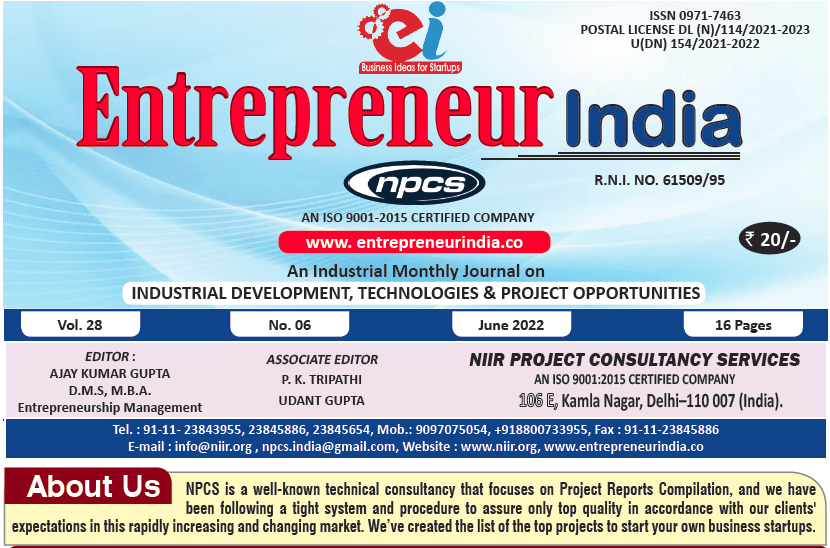 June 2022 Entrepreneur India monthly magazine published by Niir Project Consultancy Services, aims to elucidate the technique of selecting the most suitable Business Ideas for investment. It makes business decisions easier by providing a list of suitable Business for investment. "Entrepreneur India," unlike any other project investment publication, is dedicated to identifying excellent investment opportunities.