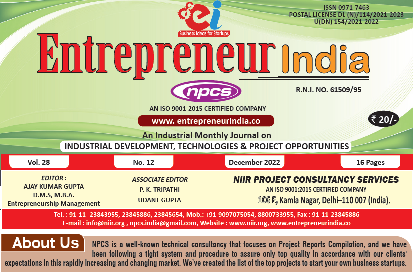 December 2022 Entrepreneur India monthly magazine published by Niir Project Consultancy Services, aims to elucidate the technique of selecting the most suitable Business Ideas for investment. It makes business decisions easier by providing a list of suitable Business for investment. "Entrepreneur India," unlike any other project investment publication, is dedicated to identifying excellent investment opportunities.