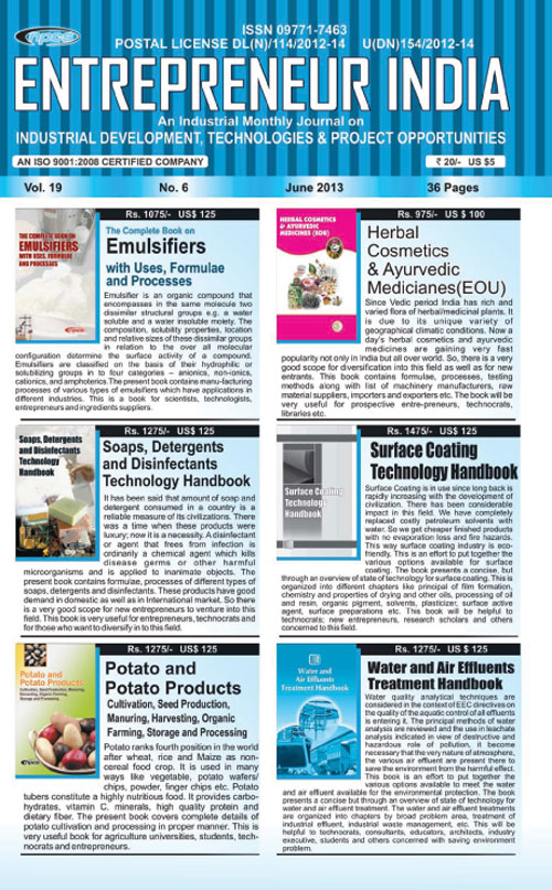 June 2013 Entrepreneur India monthly magazine published by Niir Project Consultancy Services, aims to elucidate the technique of selecting the most suitable Business Ideas for investment. It makes business decisions easier by providing a list of suitable Business for investment. "Entrepreneur India," unlike any other project investment publication, is dedicated to identifying excellent investment opportunities.