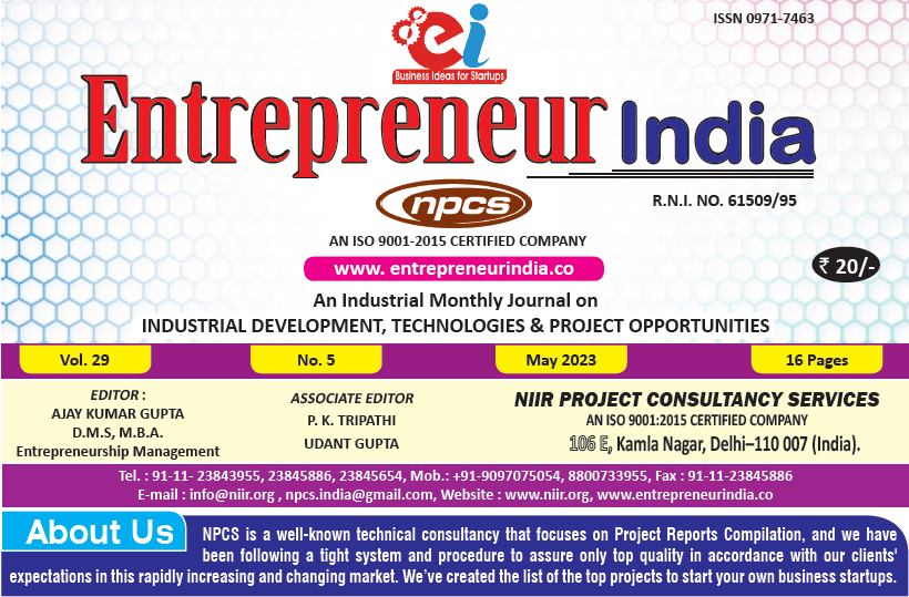 May 2023 Entrepreneur India monthly magazine published by Niir Project Consultancy Services, aims to elucidate the technique of selecting the most suitable Business Ideas for investment. It makes business decisions easier by providing a list of suitable Business for investment. "Entrepreneur India," unlike any other project investment publication, is dedicated to identifying excellent investment opportunities.