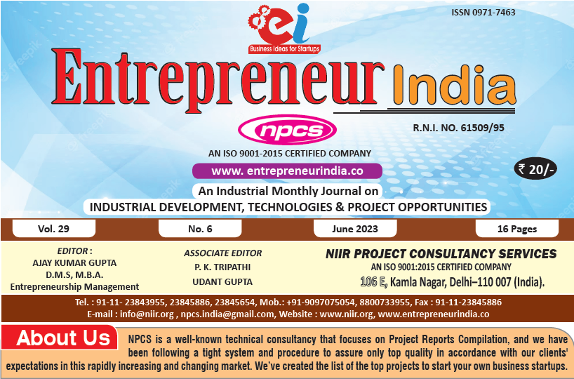 June 2023 Entrepreneur India monthly magazine published by Niir Project Consultancy Services, aims to elucidate the technique of selecting the most suitable Business Ideas for investment. It makes business decisions easier by providing a list of suitable Business for investment. "Entrepreneur India," unlike any other project investment publication, is dedicated to identifying excellent investment opportunities.