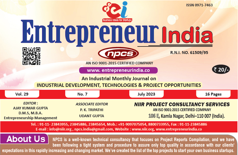 July 2023 Entrepreneur India monthly magazine published by Niir Project Consultancy Services, aims to elucidate the technique of selecting the most suitable Business Ideas for investment. It makes business decisions easier by providing a list of suitable Business for investment. "Entrepreneur India," unlike any other project investment publication, is dedicated to identifying excellent investment opportunities.
