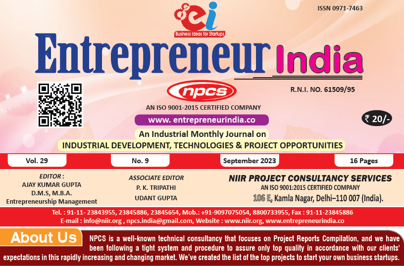 September 2023 Entrepreneur India monthly magazine published by Niir Project Consultancy Services, aims to elucidate the technique of selecting the most suitable Business Ideas for investment. It makes business decisions easier by providing a list of suitable Business for investment. "Entrepreneur India," unlike any other project investment publication, is dedicated to identifying excellent investment opportunities.