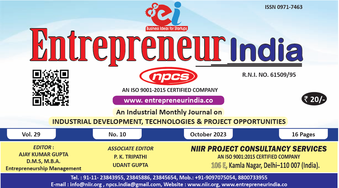 October 2023 Entrepreneur India monthly magazine published by Niir Project Consultancy Services, aims to elucidate the technique of selecting the most suitable Business Ideas for investment. It makes business decisions easier by providing a list of suitable Business for investment. "Entrepreneur India," unlike any other project investment publication, is dedicated to identifying excellent investment opportunities.