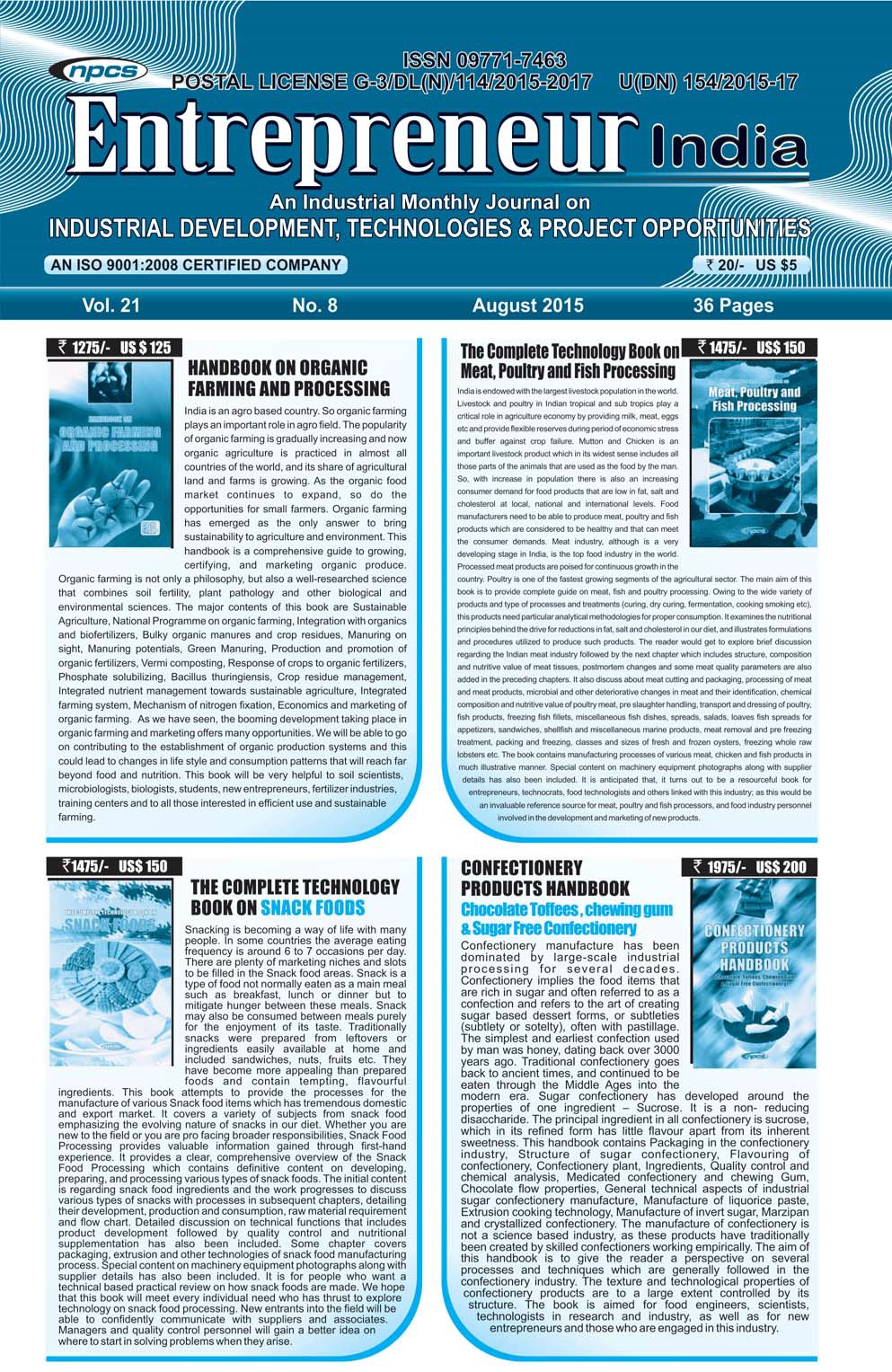 August 2015 Entrepreneur India monthly magazine published by Niir Project Consultancy Services, aims to elucidate the technique of selecting the most suitable Business Ideas for investment. It makes business decisions easier by providing a list of suitable Business for investment. "Entrepreneur India," unlike any other project investment publication, is dedicated to identifying excellent investment opportunities.